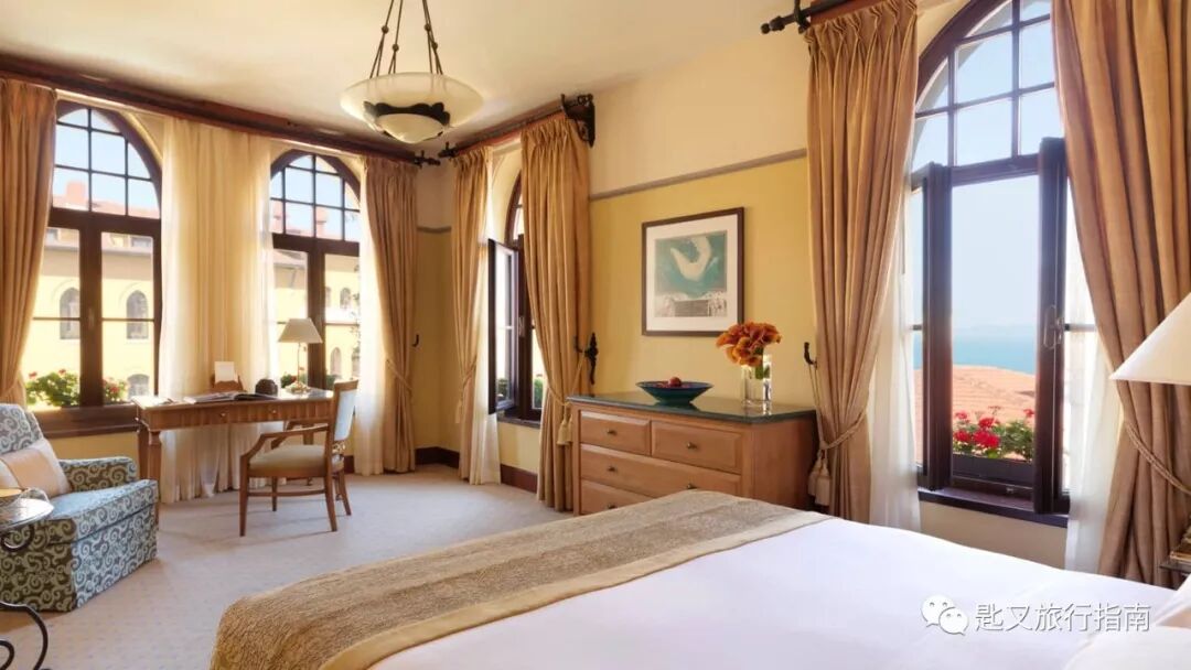 房间以明亮色调为主,大落地黑框玻璃窗,卧室同样是土耳其风格地毯,床后的墙身用织皮点缀。客房设有宽敞的步入式衣橱,书桌上装饰有土耳其本地画家的作品。细节从摆设处可见一斑。