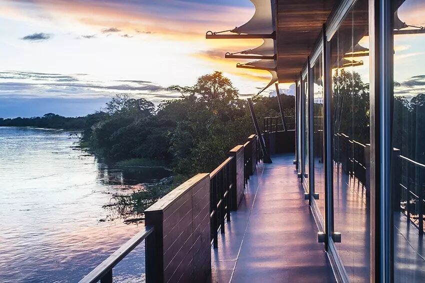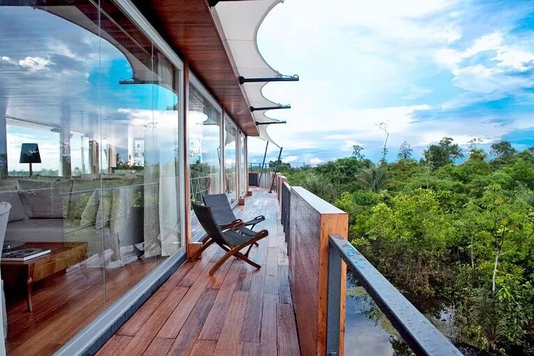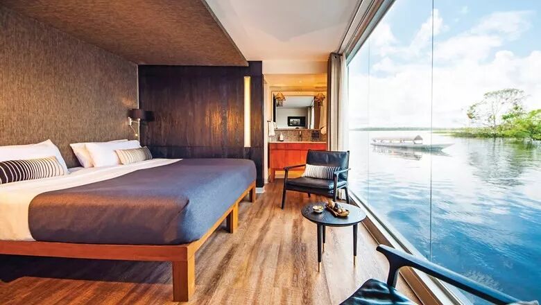 但这两艘船都沿袭了其公司的一贯特点——每间房都拥有一览无余的河景。区别于一般游轮,两艘船没有船形外身,反而像是将整排房子建在船板上。这样的设计让每间房子都有大地玻璃窗正对亚马逊河,游客在房间里就能将绚美河景尽收眼底。