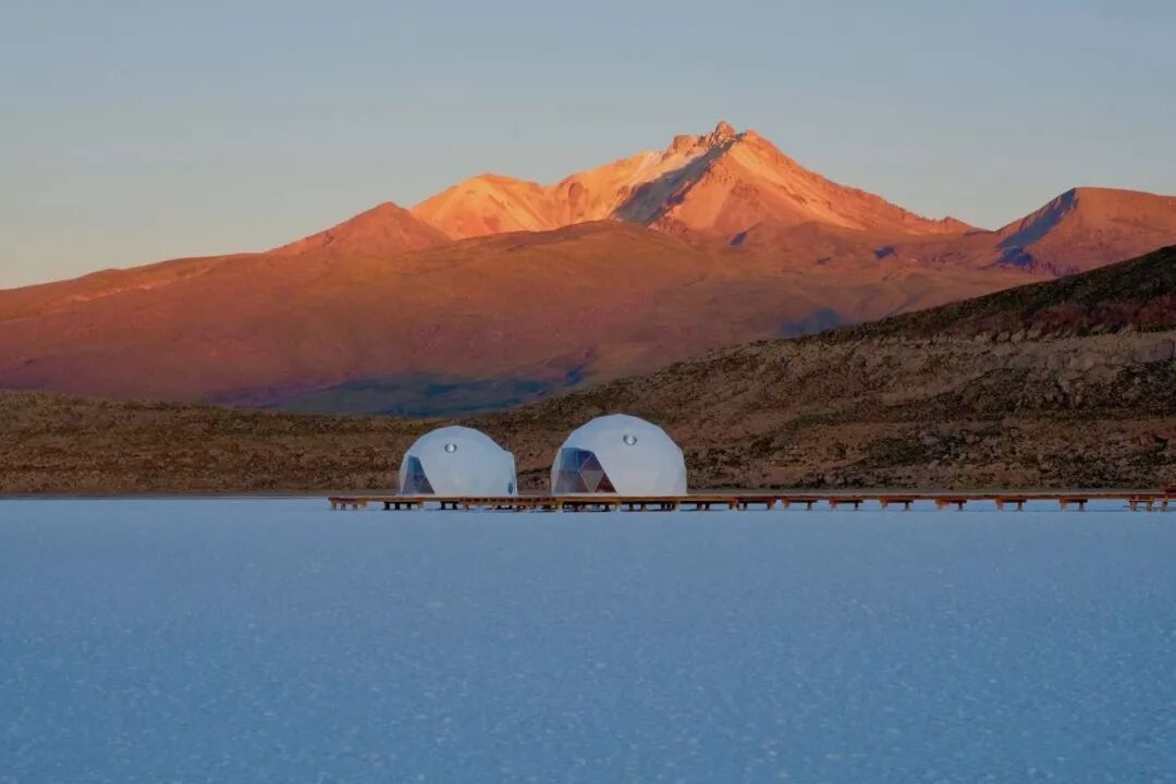 Kachi Lodge散落在空旷的干旱盐湖上,于2018年12月开幕,瞬时惊艳八方。这些形似太空站的星球小屋正好与天空之境这样仿若异星球的奇特地貌完美呼应,住进这样的酒店,一定是毕生难忘的经历!