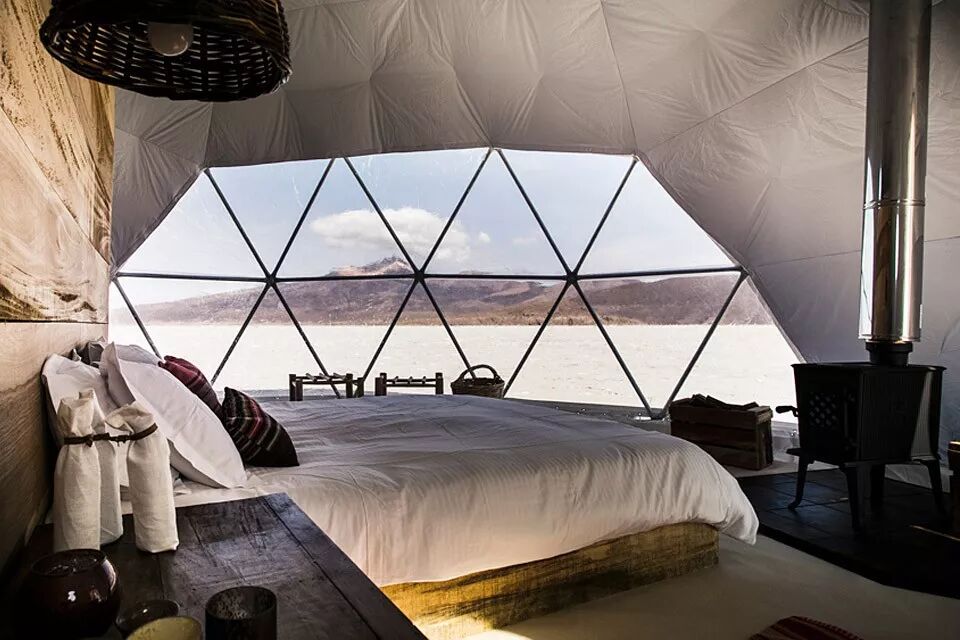 不过,星球小屋却比宇航员的太空舱舒适得很 。除了外观建筑完美融入自然环境,室内设计也坚持绿色原生态,原木材质,陶瓷手盆,玻利维亚纺织品……都被巧妙利用。这里还配备有壁炉、kingsize大床、独立浴室,不管外面多么干燥、寒冷,室内始终温馨舒适,令人放松。