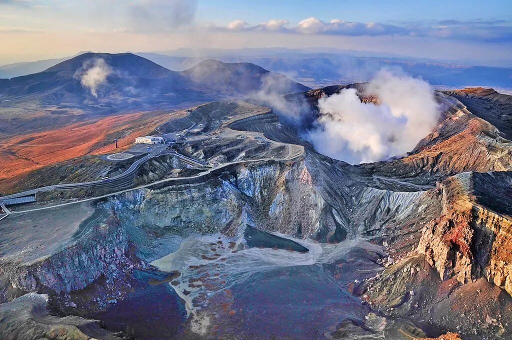 阿苏火山是九州熊本县著名的活火山,直径超过25公里,有着当今世界上最大的破火山口。火山口的中央耸立着阿苏五岳,即根子岳、高岳、中岳、乌帽子岳、杵岛岳,其中中岳至今仍有频繁的火山活动,景致十分壮观。在中岳火山口周围设有散步道,你可以搭乘索道或驾车上山。