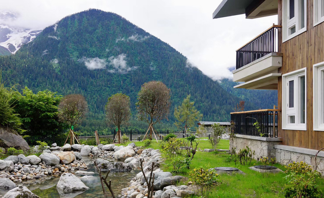 来古山居是目前来古村内唯一在的酒店,可谓是观赏来古冰川的绝佳选择。酒店将近一半的建筑藏于山体内部,仿佛镶嵌在悬崖上,面对来古冰川,与自然风景融为一体。在房间的大落地玻璃前,凝望这沉睡千年的冰川,一切仿佛触手可及,思绪随即完全放空。