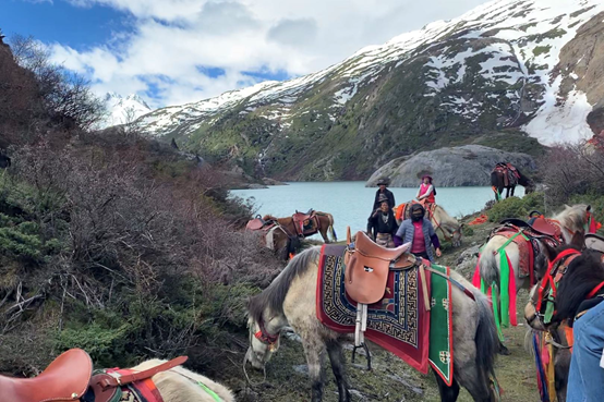 伴着“铛铛铛”的铃铛声骑着马穿过村庄、迈过鹅暖石滩、翻过高山草甸,趟过小溪,终于来到高山圣湖。