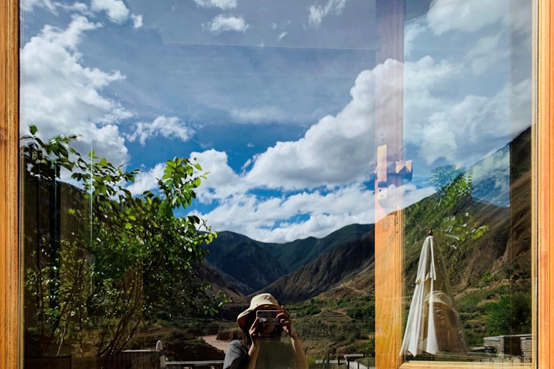 在依山而建的波密酒店休整一晚。这里的建筑空间如蒙太奇镜头切换,成为存在于人和山水之间的一种氛围。与来古冰川带来的的粗犷感不同,眼前有的是河、滩、桃树、连绵的远山和云雾,是阳光普照下的诗意和暖融。