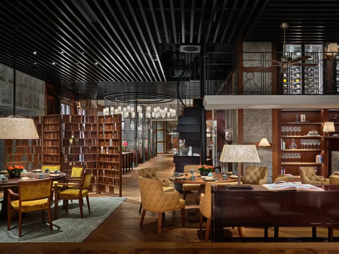 广御轩由东京设计公司Super Potato设计,由以灯笼为灵感的灯饰、现代摩登的吊扇与深色木质墙面点缀着。吧台、书柜、沙发、餐桌......仿佛置身于一幢优雅别致的豪宅之中,现代时尚却极富南洋气息。