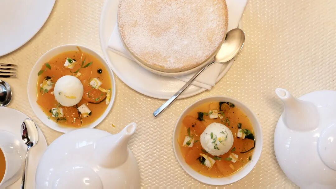 虽然舒芙蕾保持了蛋奶原味,但随餐会搭配两大碗橙子果冻与橄榄油冰淇淋。一碗一只手捧不过来的巨大舒芙蕾,延长了热气的保留时间,更加突出了蛋糕与果冻之间的冷热差异。一大勺舒芙蕾,再来一大口酸甜橙味果冻冰淇淋,强烈的满足感与分享的快乐,一定是一场晚宴结束前又一次掀起的小高潮时刻。