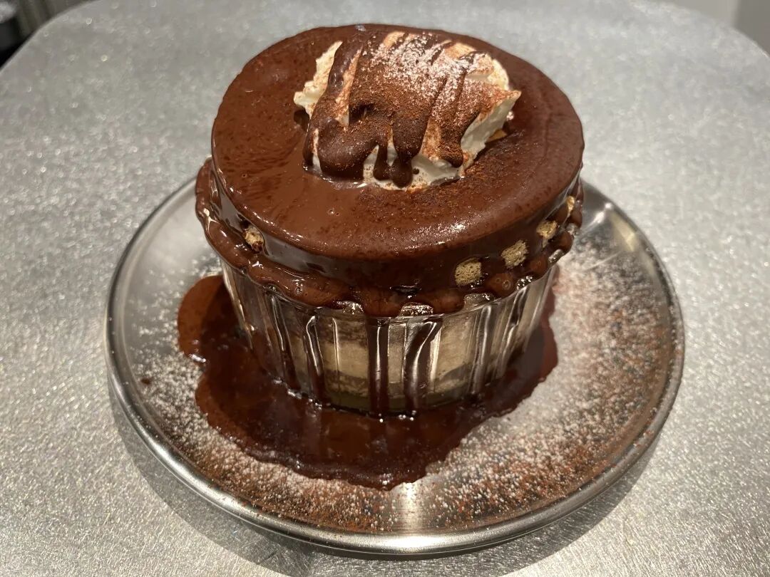黑巧克力奶油芝士舒芙蕾一看就是个硬核角色,浓郁的巧克力酱搭配原味奶油已经足够美好,芝士的加入不仅平衡了口味,更增添了口味层次。