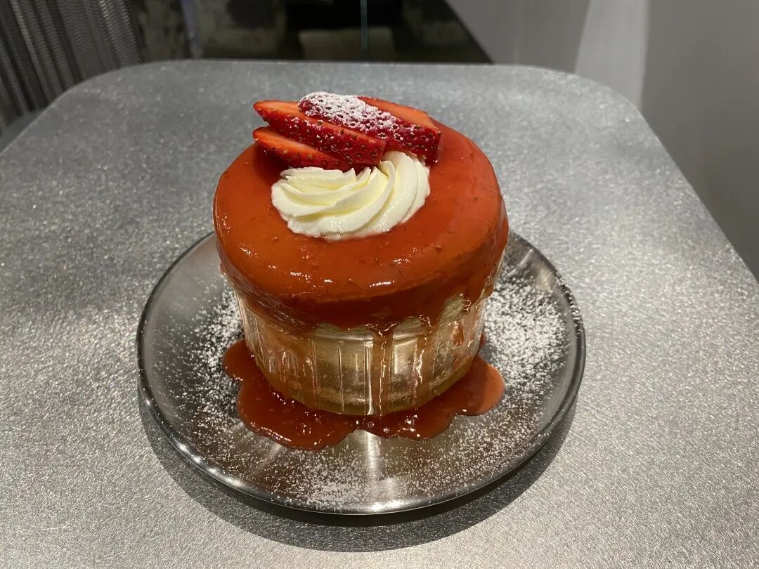 香草+草莓的搭配是经典的原味,最能尝出基本功如何,蛋糕体没有因为顶部的装饰而塌陷,是个合格的挺括舒芙蕾。大量的草莓酱瀑布一般浇在顶部,香草奶油和新鲜的草莓果肉组合似乎在呼唤着勺子使劲挖下去。