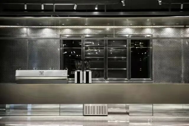12米长的不锈钢门板连接店铺大门与所有落地窗,只要挪动一次,所有的门窗都能显露出来,而原始外立面被完全遮挡,下班时也只需要拉动一次,所有的门窗即被关上,重新露出红色的砖墙。
