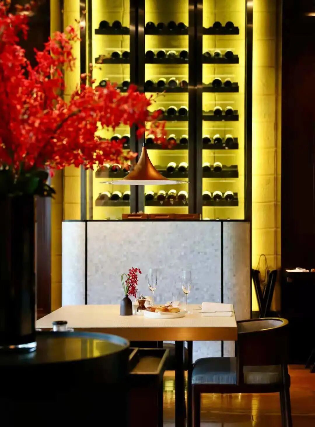 PHÉNIX巨大的落地窗外不是广阔的浦江风光,也不是车水马龙的高空景观,只有茂密的水杉和竹林隐去了繁华都市的喧闹。Living room式的舒适吧台和隐秘小巧的用餐区各自成趣,让人还未用餐就心情大好。