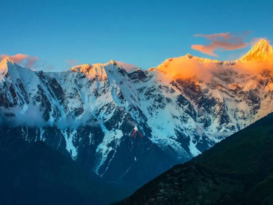 白天的南迦巴瓦峰纯净无暇,而黄昏时分随着夕阳的照射,白色的山体染上了余辉,先是淡黄色,紧接着转换成金色,这就是藏族人口中的“日照金山”。只有看过这天空下金光灿烂的耀眼景观,才能明白为什么藏族人对高山如此崇敬。