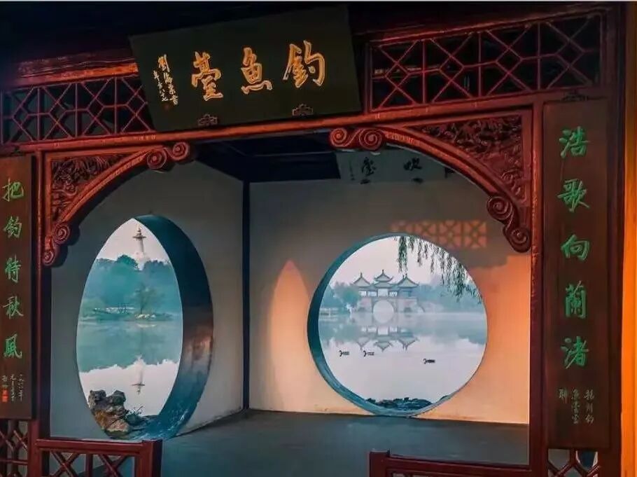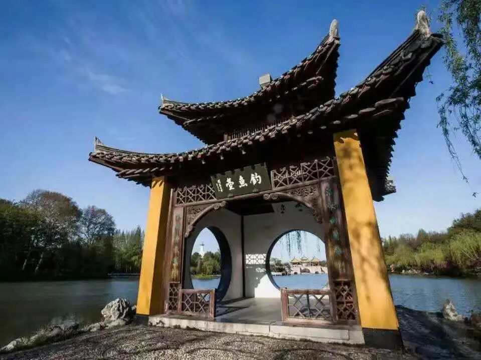 小小的一座钓鱼台,却是中国亭建筑的典范。圆形的门体现了中国园林的“框景”艺术,站在亭内向外看,四处皆是如画一样构造精巧的风景。