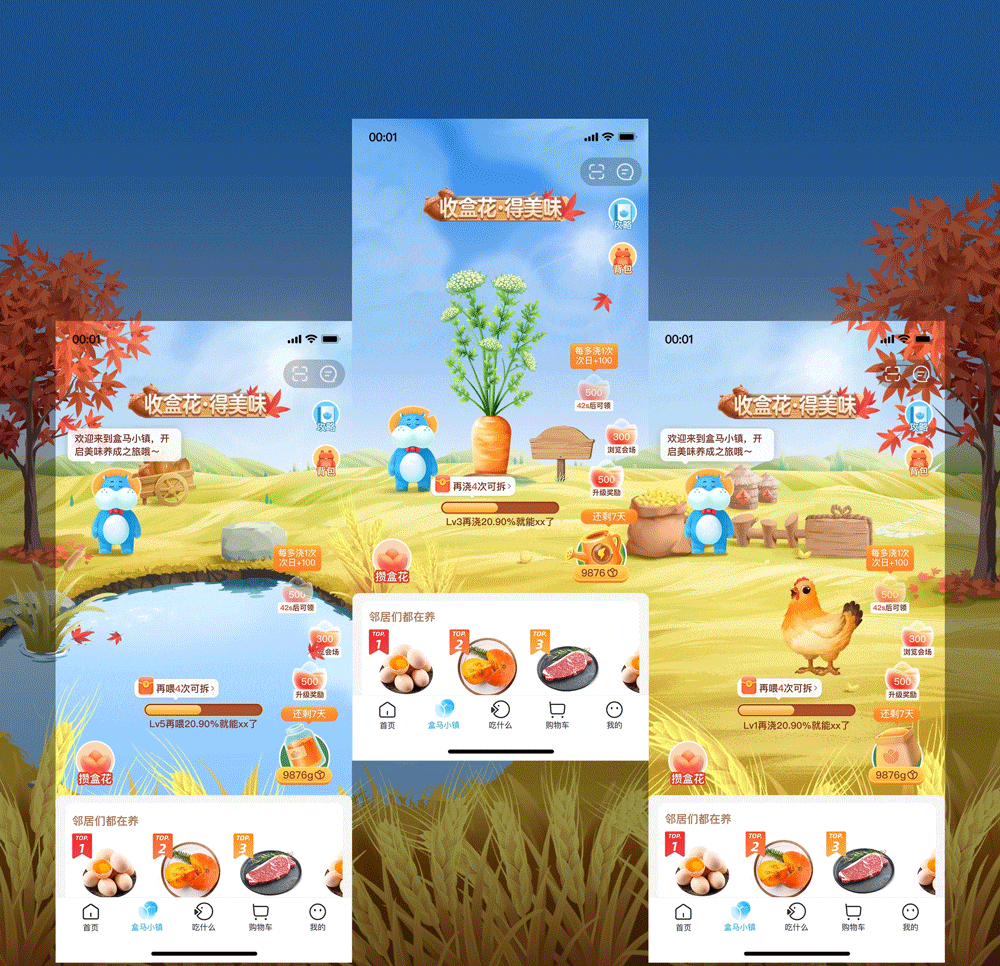 在场景中根据商品进行场景分类,让用户产生自己尝到亲手种植出来的劳动果实的美味,刺激用户的既得利益和成就感。