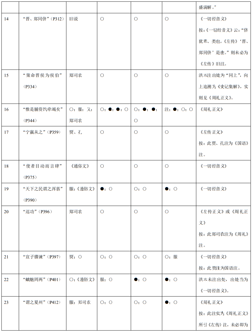 [23]“●”“○”分别表示“有”“无”。如第一行所表达的意思是:在中华本《春秋左传诂》第183页“摄也”下,洪本辑有贾、服注一则,刘、贾、颍注一则,贾注一则;王本仅有贾、服注一则;余本有刘、贾、颍注一则,并额外辑录颍注一则;严本不仅有洪本所辑的三条旧注,也有余本额外辑录的颍注。