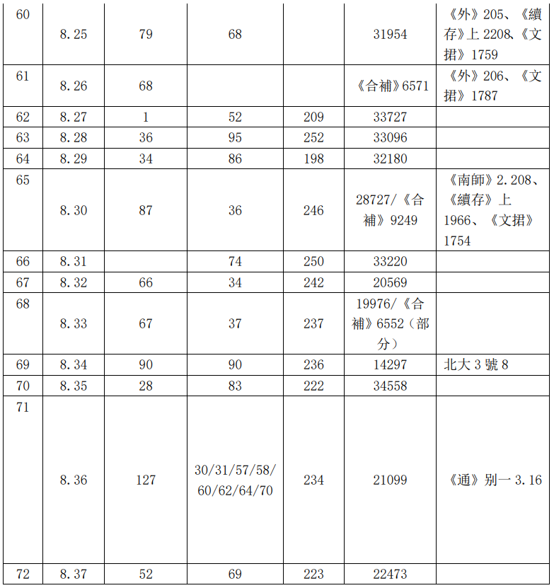 。/引吉)兩片其餘各本未見。其8.23即國圖本41(《合集》30905),歷史所本未見;其8.26即國圖本68(《合補》6571),歷史所本未見;其8.31即歷史所本74(《佚》250、《合集》33220),國圖本未未見。其餘皆見國圖本和歷史所本。而《通》别一所收16片皆見北大圖書館藏本,《佚》61片亦皆見北大圖書館藏本。由此亦可證《佚》所收繪園甲骨與北大圖書館藏本、《通》所據繪園甲骨底本三者來源相同,繪園甲骨拓本存在一套72片(或71片)本。
