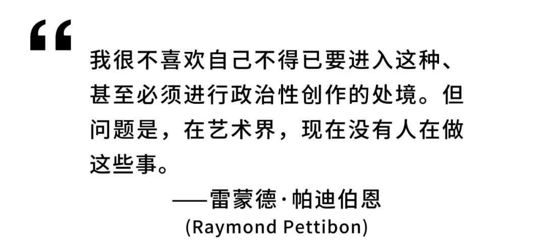 雷蒙德·帕提伯恩(Raymond Pettibon)戈登:很多东西永远不会消失。就像政治艺术永远不会消失一样,就像你的作品《无题(你杀了—谋杀了—)》(2007年)。(这件作品中,一位女性站在挂着美国国旗的棺材上,她手指布什总统说:“你杀害了我的儿子!”在棺材的另一侧,卡尔·罗夫(Karl Rove,时任共和党高级顾问)说:“她疯了!这是很友好的开火!”迪克·切尼(Dick Cheney,时任美国副总统)说:“别听她的话。她对你而言,不比世界法院的权力大。”前国务卿赖斯(Condoleezza Rice)说:“她可以做出指责,但不能起诉。”布什回答说:“你只是因为失去了儿子而伤心难过。”)。帕提伯恩:有些作品是带着沉痛的心情说出来的话。比如艺术家大卫·沃纳洛威茨(David Wojnarowicz),他的作品里有很多当时围绕着他发生的事,那种因为艾滋病带来的破坏你是没法忽视的。在我的作品中,比较与众不同的是,作品不会轻易地导向身份政治。我的意思是,老天啊,无论是商业、政治、新闻,只要你守口如瓶不说N开头的那个词,那一切都挺好。但与此同时,你知道到底有多少数以百万计的人呆在监狱系统中吗?相比之下,你守口如瓶真是太容易了。![]()