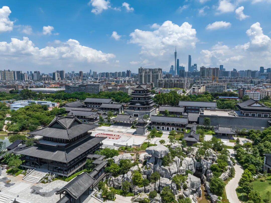 在现场可看到,一栋栋古色古香的传统建筑外部已经完工,风格各异,园区与海珠湿地公园一水之隔,可观落日倒映湖面,登楼远眺,更是与广州塔遥相呼应。