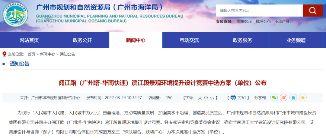 8月24日,广州市规划和自然资源局官网公布阅江路滨江段景观环境提升设计竞赛中选方案,确定“珠联碧合,跃动广心”为中选方案!