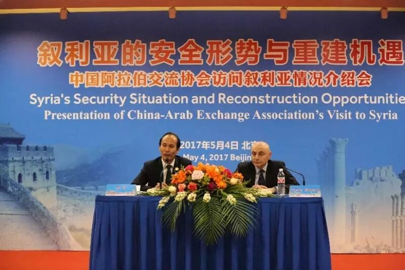 2017年5月4日下午,“叙利亚的安全形势与重建机遇——中国阿拉伯交流协会访问叙利亚情况介绍会”在北京举行。这是中国国内首次举办叙利亚战后重建会议。中国阿拉伯交流协会副会长秦勇出席会议,介绍叙利亚访问的有关情况,并介绍叙利亚的安全形势与重建机遇。同时,叙利亚驻华大使伊马德•穆斯塔法出席并致辞。