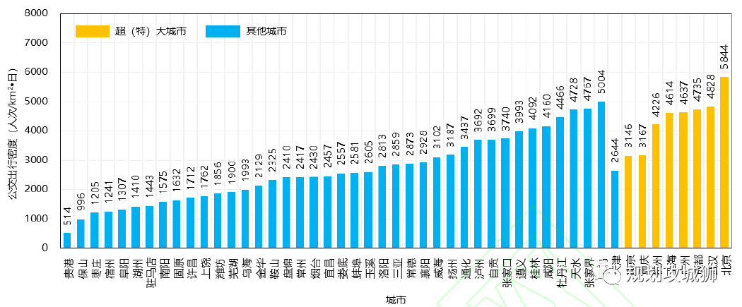 公共汽车出行密度尚无界定标准,本文参考城市路网和人口密度的定义,将其定义为单位城市建成区面积上的日均公共汽车出行量,单位为人次·km2/d。该指标综合反映了城市居民公共汽车出行意愿,在一段时间内相对稳定,但又受公共汽车线网布局、服务水平的影响,随城市发展动态变化。