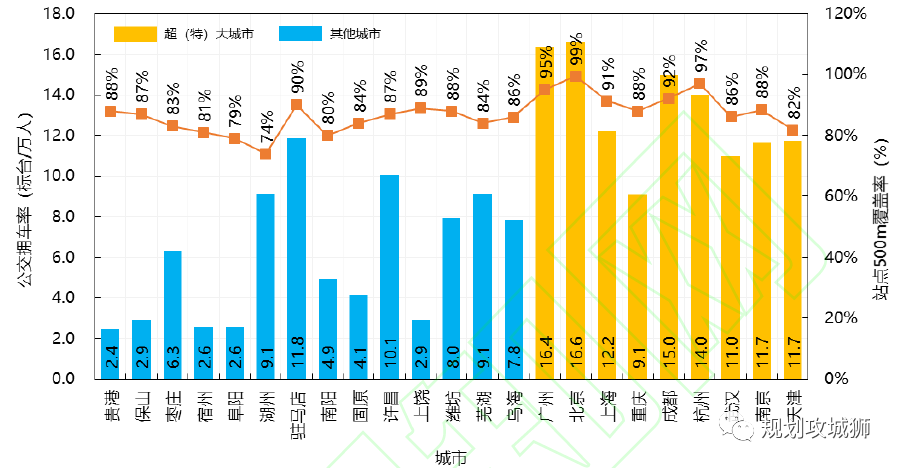 图3 公共汽车拥车率及车站500 m 覆盖率对比
