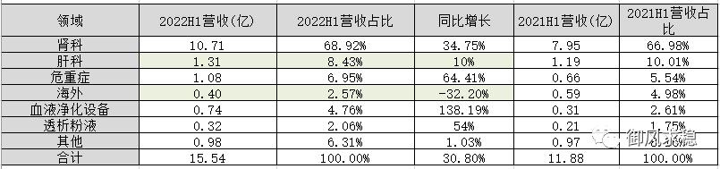 这是首个将血液灌流的适应症拓展到中毒之外领域的官方文件。此外,一系列的文件以及研究成果,不断为血液灌流器的适用症推广打下了基础。目前健帆的适用症主要分布在肾科、肝科、危重症(含中毒)三大领域。健帆又把肾科、肝科统称为慢病。根据2022H1中报,健帆目前在各领域营收情况如下: