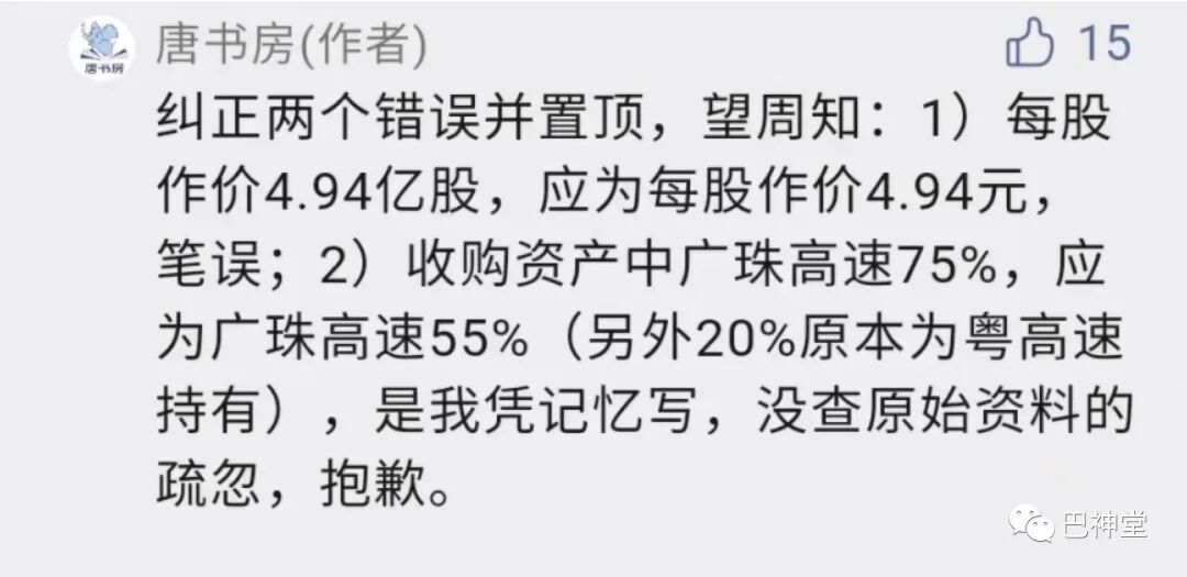 记得在读完粤高速财报后,对老唐“一尺栅栏粤高速”的答案中发现2处疑问后(收购广珠高速股权比例不对,这将导致收购价计算错误;还有一处小笔误),质疑是不是老唐错了,最后在文章留言中看到老唐的置顶,满心欢喜,看来自己是用心看财报了。