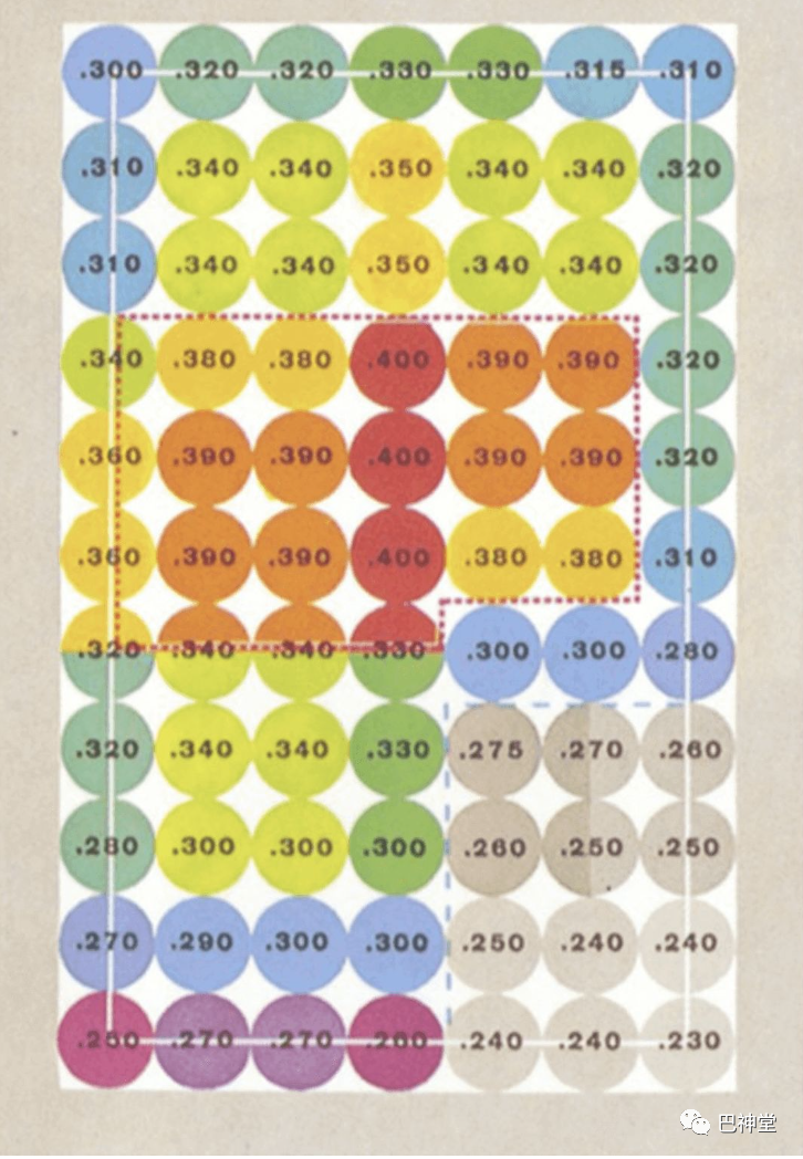 1、泰德把击球区划分为77个格子,每个格子都是一个棒球的大小。2、给每个格子按照击打成功率打分。3、严格自律,只打最佳击球区的好球(图中得分最高的圆圈区)。只有球进入好球区,他才会挥棒出击。
