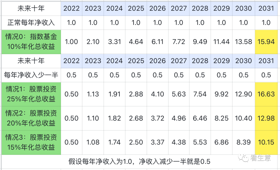 假设,每天少工作5个小时,会导致净收入减少一半,同时研究股票投资,用一半的净收入,获得了比指数基金更高的年化收益率,10年后会是什么结果呢?