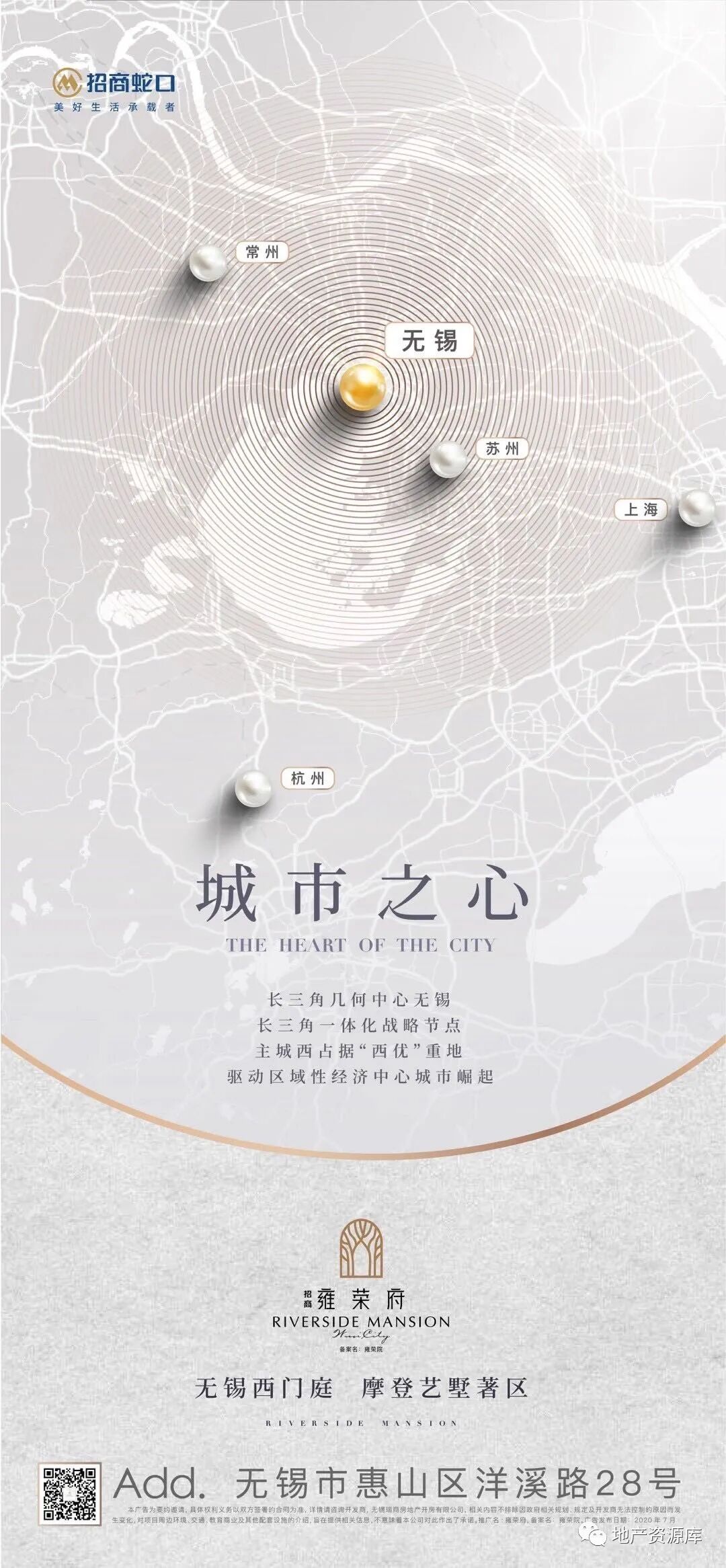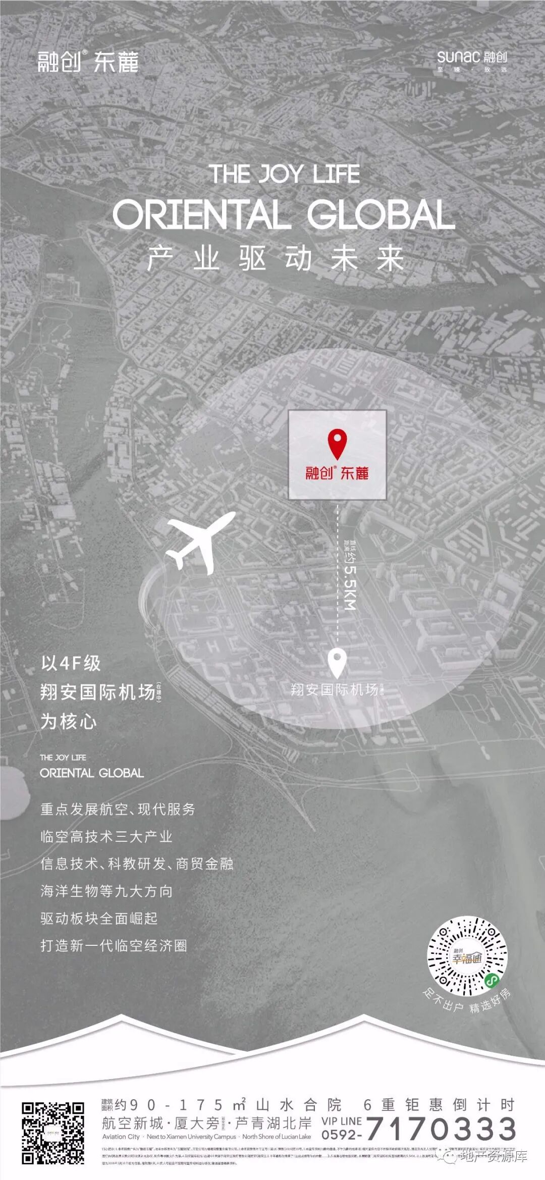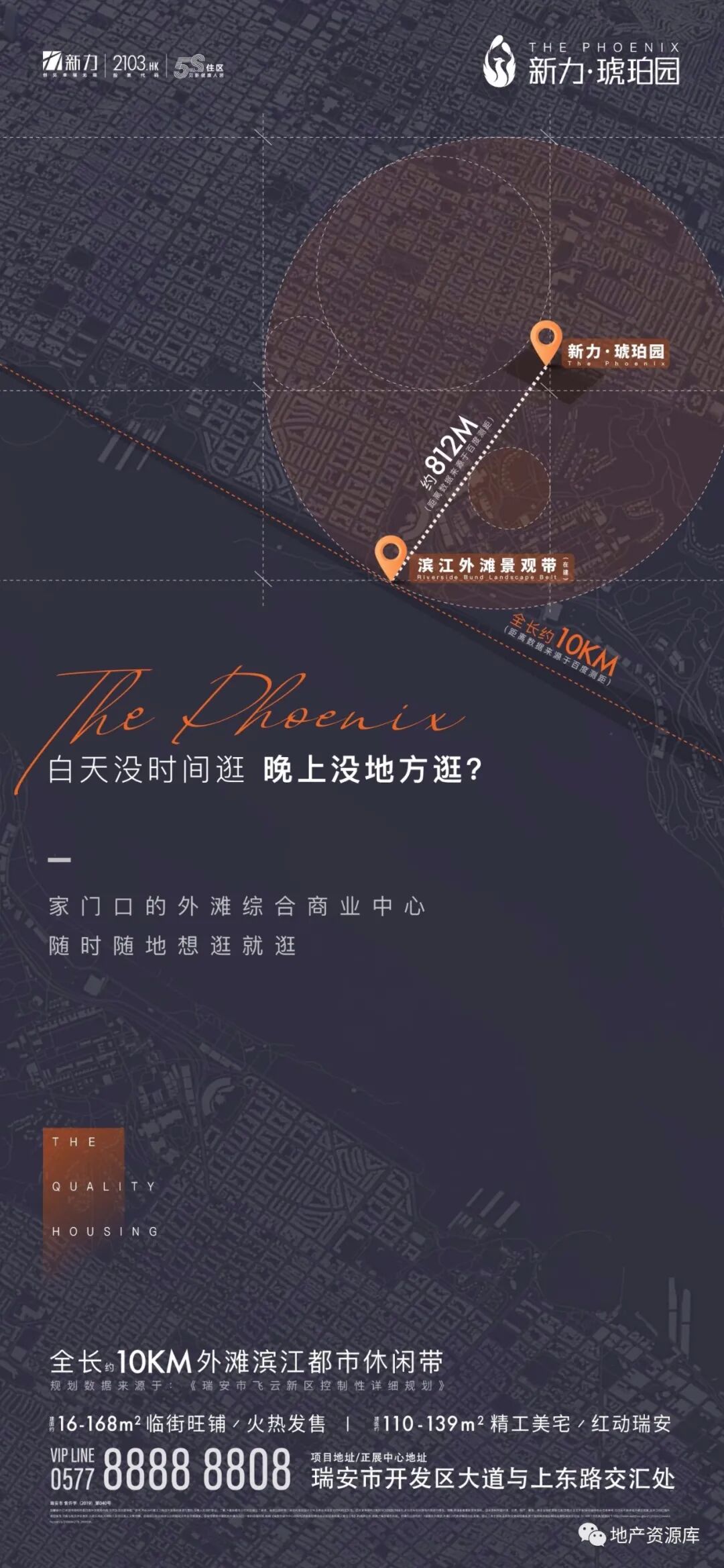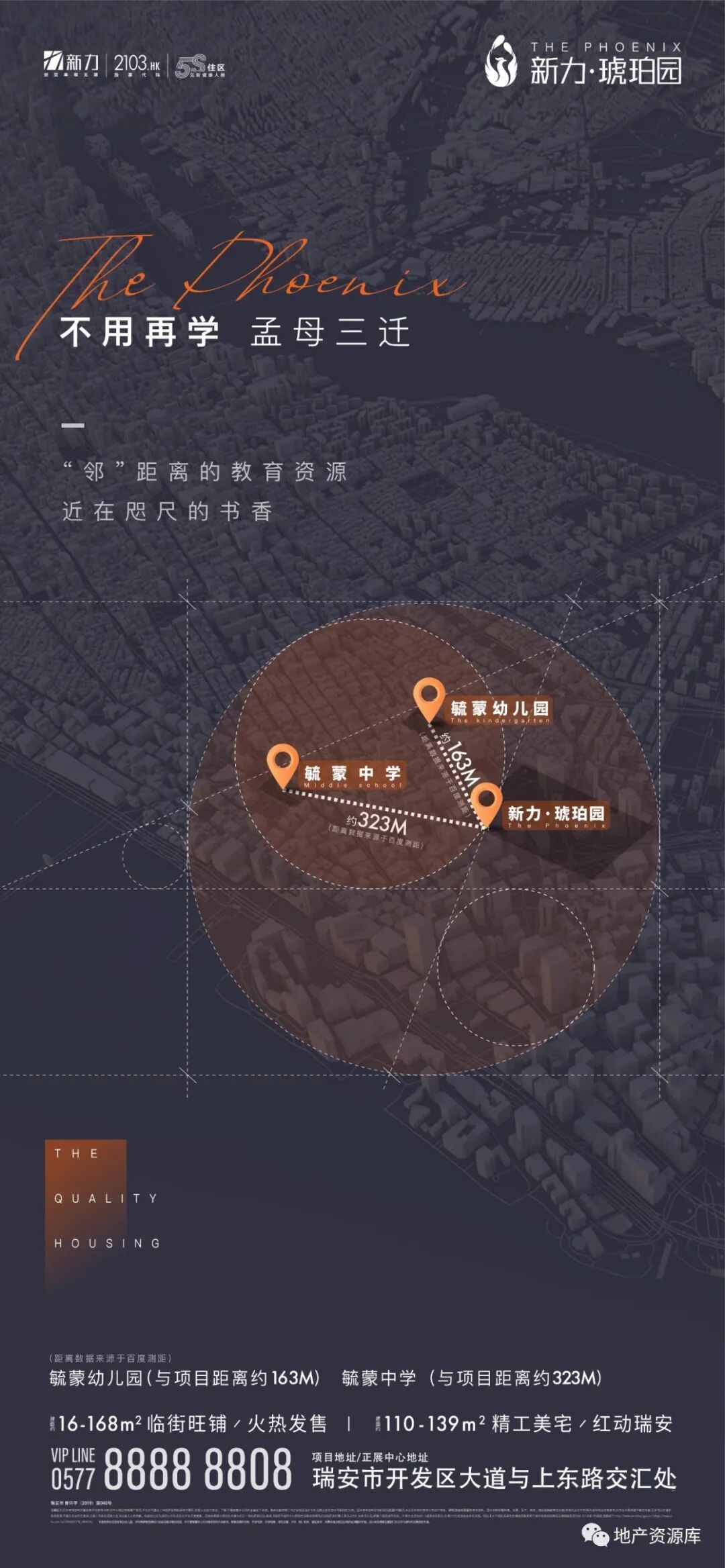 第2种思路是:区域实景图或区位图+实景图的形式,这种思路的整体质感跟第一种相比,还是差了一些。毕竟实景图加上很多文案,还是比较难设计的,想要画面干净,是比较难的。