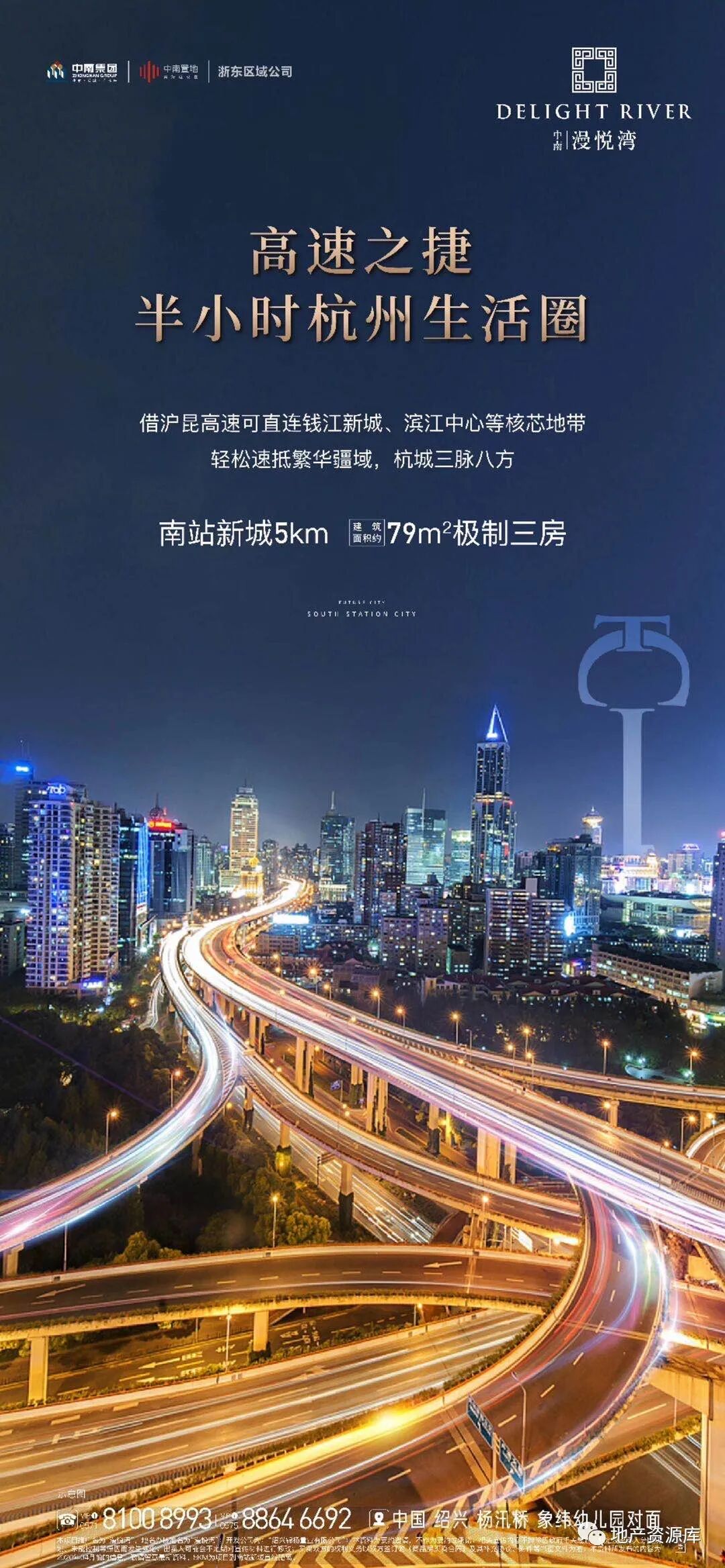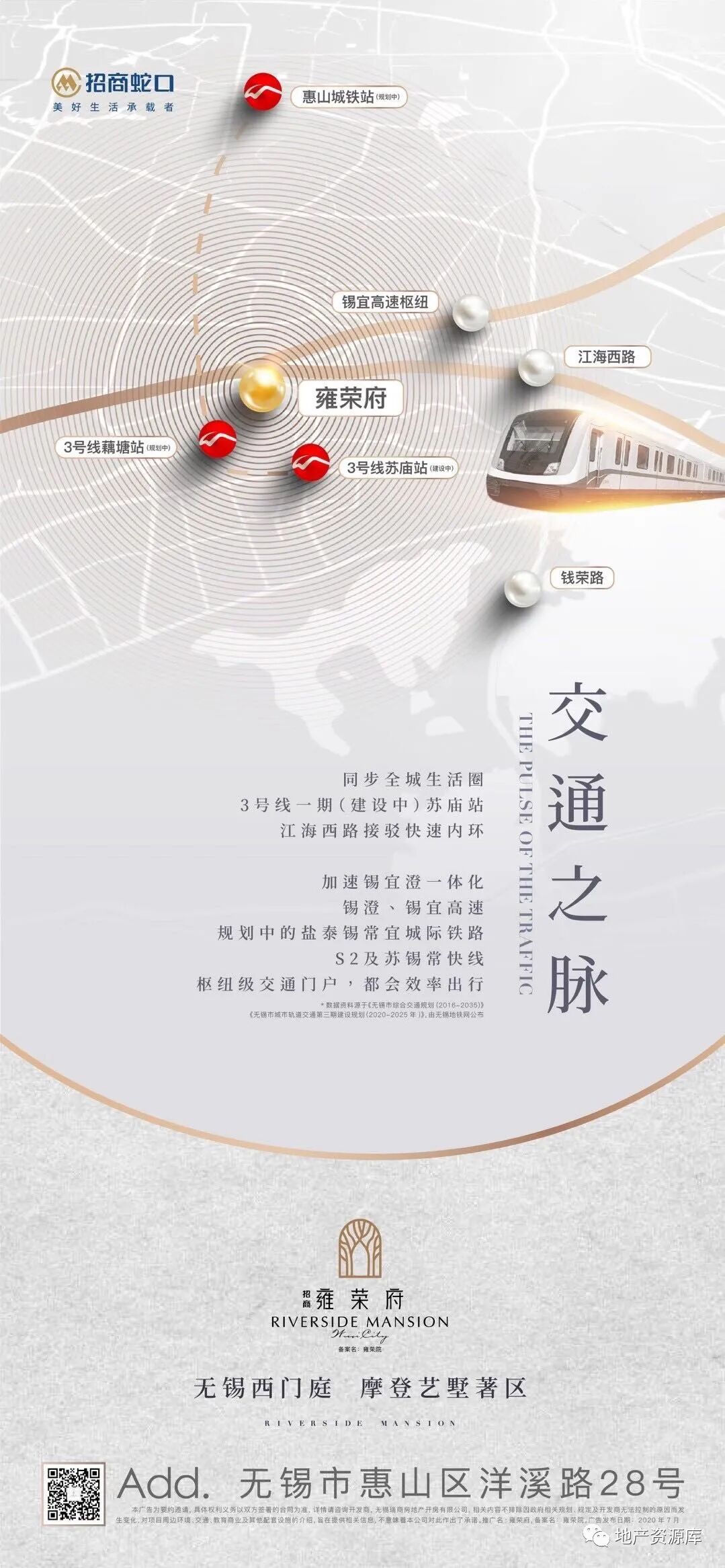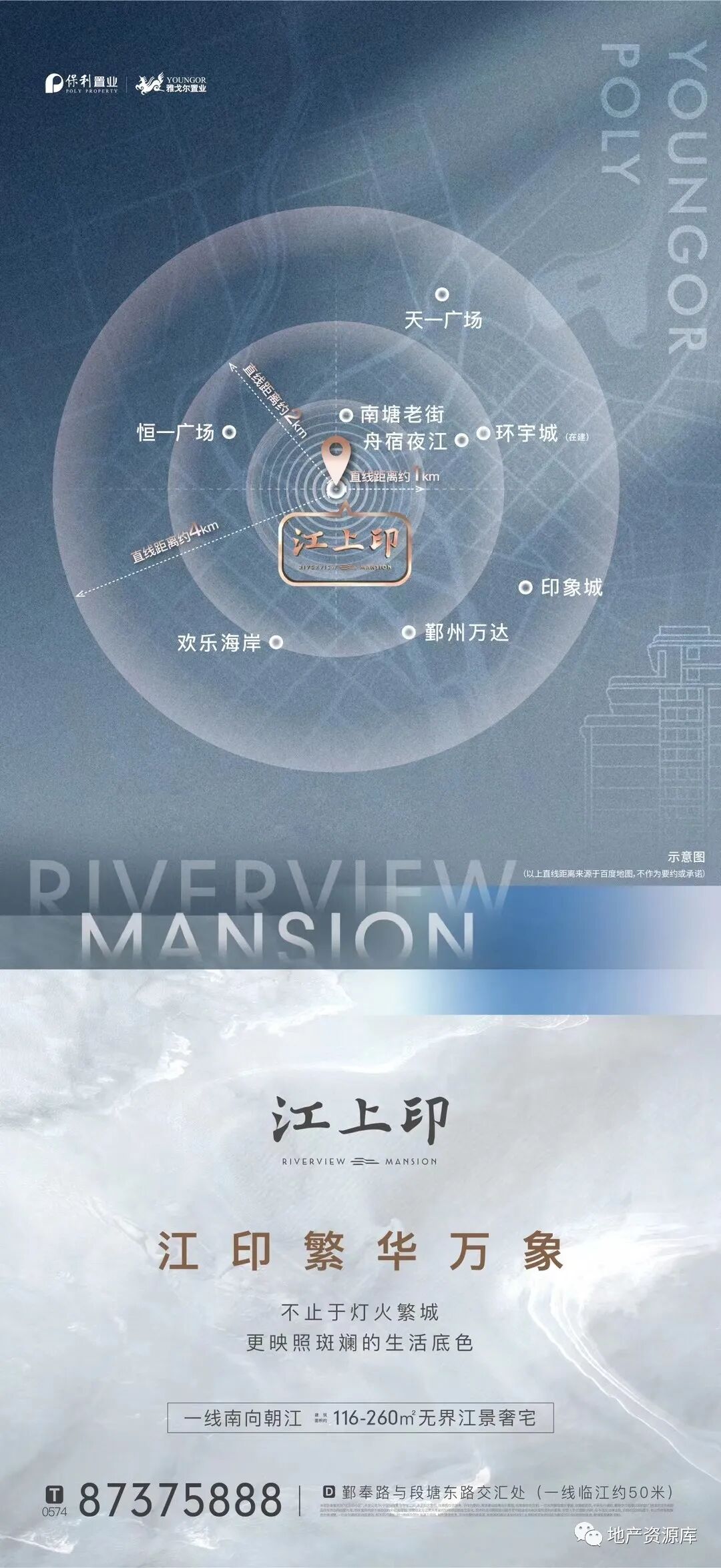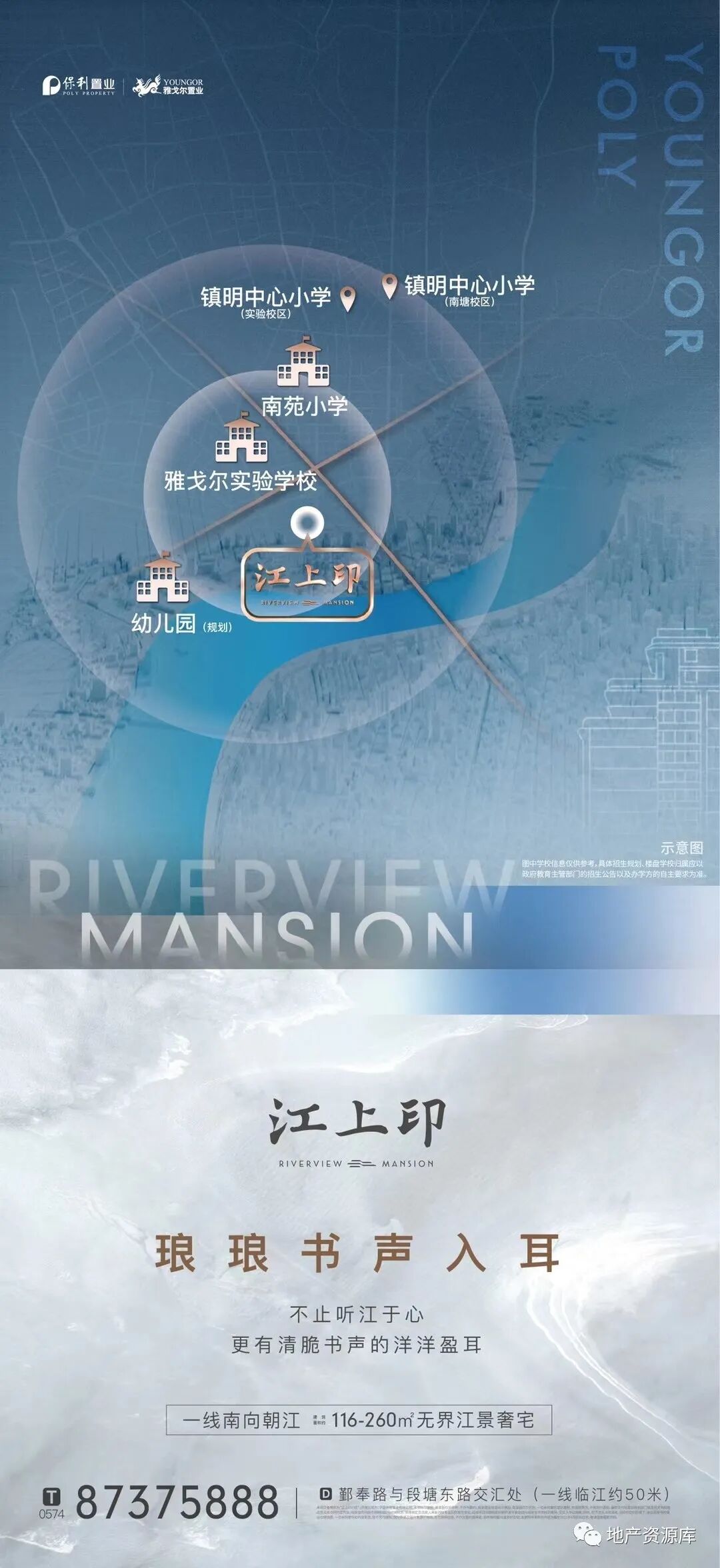 第2种思路是:区域实景图或区位图+实景图的形式,这种思路的整体质感跟第一种相比,还是差了一些。毕竟实景图加上很多文案,还是比较难设计的,想要画面干净,是比较难的。