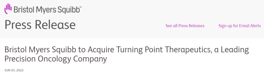 就在中国端午节这一天,即2022年6月3日,全球制药巨擘百时美施贵宝(Bristol-Myers Squibb,简称BMS)和纳斯达克上市公司Turning Point Therapeutics宣布了一项最终合并协议,百时美施贵宝将以每股76.00美元的价格现金收购Turning Point Therapeutics,总金额为41亿美元。该交易得到了两家公司董事会的一致批准,预计将于2022年第三季度完成。