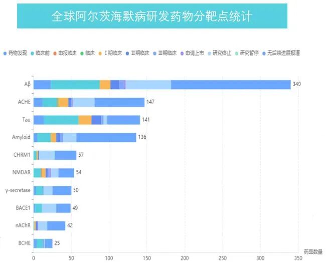 根据发病年龄,阿尔茨海默病可分为早发性AD(EOAD)和晚发性AD(LOAD)两种,早发性AD在65岁之前发病,晚发性AD在65岁之后才发病。按有无家族遗传史又可分为家族性AD(FAD)和散发性AD(SAD)。家族性AD多为早发性,发病多在40-65岁之间,呈常染色体显性遗传;而散发性AD的患者一般都在65岁之后发病,这种类型的患者占总体的95%左右。1984年,Glenner和Wong从AD患者的斑块中分离出一种β肽,后来对其进行了部分测序,随后促使了淀粉样β前体蛋白(APP)的基因克隆。这一生化发现后来得到了致病AD基因的基因突变图谱的证实,包括1991年的APP基因和1995年的早老素(PSEN1/PSEN2)基因。1986年左右,人们证明过度磷酸化的tau是AD脑组织中神经原纤维缠结的主要成分。Tau基因(MAPT)的突变与其他几种神经退行性疾病有关,如额颞叶痴呆(FTD)。生化和遗传学证据再次确定了tau假说,并强调了tau在AD进展中的关键作用。普遍观点认为,大脑中存在的β淀粉样蛋白(Aβ)和过度磷酸化Tau蛋白组成的神经原纤维缠结驱动了阿尔兹海默症,这一假设在该领域已经主导了超过25年。全球大部分药企的AD研发管线几乎都围绕这两个被普遍认可的学说开展。人们还假设了无数的其他模型:胆碱能,钙,线粒体,膜运输,炎症,淋巴,微生物感染,神经血管和细胞相假说,然而这些替代性的概念与淀粉样蛋白和tau理论框架仍然难以区分。事实仍然是,Aβ可能是导致AD的必要因素,但不是充分因素。然而,介导Aβ和tau毒性的分子途径、细胞回路和病理生理机制尚不完全清楚。几十年来,科学家们一直努力研究,通过靶向作用疾病过程中的关键基因来开发新型阿尔兹海默病疗法,但收效甚微。新的治疗方式通常是针对淀粉样蛋白和tau等传统靶点开发的,而在新的靶点上,大多是传统的治疗方式,例如小分子。值得注意的是,大约一半的多靶点干预是细胞疗法。尽管研究者们做出了各种尝试和努力,仍有200多种候选药物失败或被暂停临床试验。近年来,抗-Aβ治疗、以tau蛋白为靶点的治疗、炎症调节剂、抗氧化剂、神经保护治疗、调节细胞钙稳态、降糖药、降血脂药和中药等多种治疗方法被研究,以探索其对AD患者的潜在作用。除了APP、PSEN1和PSEN2,早在1993年的遗传学研究中人们就发现了APOE4是AD的主要风险基因。ApoE 蛋白作为大脑中的主要脂蛋白载体。这是第一个被确定的LOAD的风险基因,并且 APOE 基因型也影响家族性和早期形式AD的风险。除了APOE,其他几个LOAD 风险基因,如髓系细胞上表达的触发受体(TREM2)、载脂蛋白(clusterin) 和膜糖蛋白( sortilin 1)等都参与脂质代谢。目前AD的治疗方法主要有物理、药物及精神治疗法。虽然目前仍未有治疗AD的特效药物。但临床数据表明,一些药物对预防及治疗AD具有显著的效果。开发较多的靶点有乙酰胆碱酯酶、β淀粉样蛋白、Tau蛋白、NMDA受体和丁酰胆碱酯酶等。据药融云数据统计,截至2022.05.25,全球共有2145个阿尔茨海默病研发药物(包括 active 和 inactive),其中IND以上研发阶段的药物占比仅为13%,包括临床Ⅰ期107个,临床Ⅱ期105个,临床Ⅲ期51个。值得一提的是,以上研发药物中,处于研究终止状态的药物共有343个,无后续进展报道的有975个,二者占比达到61.45%。AD药物研发仍是举步维艰。目前上市的抗AD药物包括4种,胆碱酯酶抑制剂、NMDA受体拮抗剂、Aβ抑制剂以及肠道菌群调节剂。这些药物可以通过抑制乙酰胆碱活性促进或恢复胆碱功能,对于初期和中期 AD患者起治疗作用,维持患者认知状态。图为全球已上市AD药物,来源:《阿尔茨海默症药物研发历程回顾及最新进展》