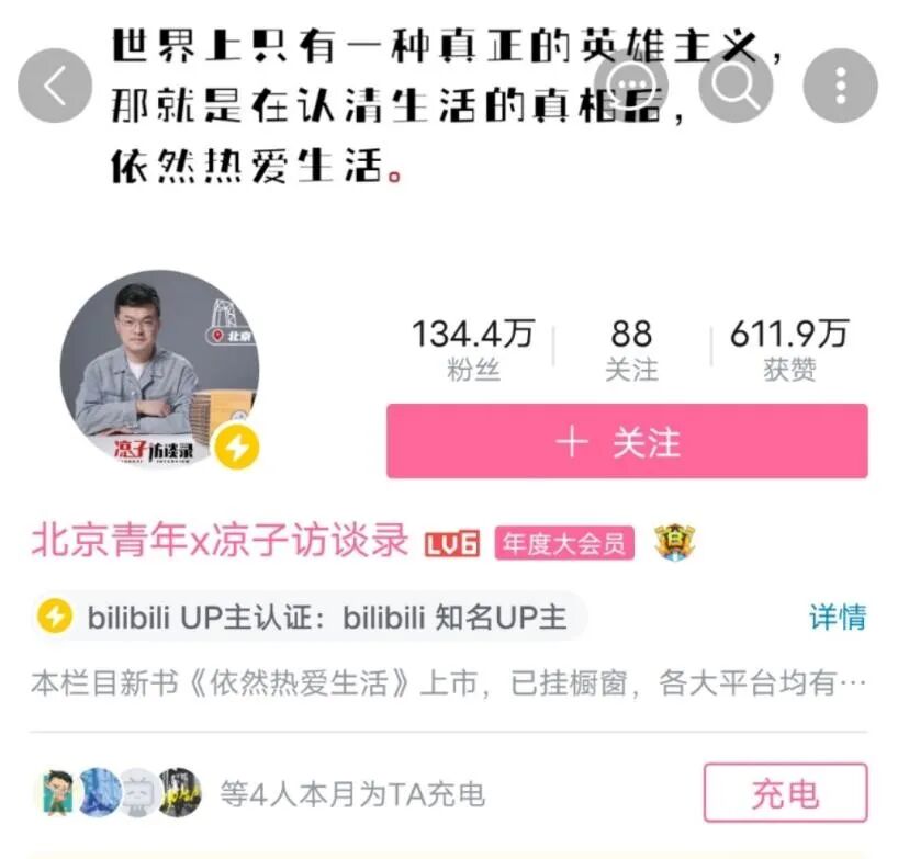这之后,《凉子访谈录》发布的《同样上清华,发现农村、城市孩子巨大差距:眼界、格局,很多不是努力就能赶得上的》《复读时去了传说中的衡水中学,看到了很多匪夷所思的事,三观被颠覆了》等视频也频频出圈,站内播放量破百万。自2020年4月3日在抖音平台发布第一条视频起,短短一年多时间,凉子团队已经采访过800多位受访者,《北京青年x凉子访谈录》B站粉丝达131万,全网粉丝超1000万,《凉子访谈录》也收获了“B站2021情感年度up主”“知乎2021新知答主““抖音人气榜top1”等称号。目前,凉子团队已经出版了书籍《依然热爱生活》。