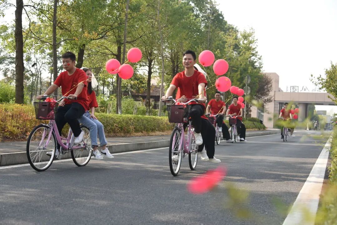 9月16日,澧县10对刚领证的新人选择了别样的方式庆祝,他们骑着装饰一新的自行车环游城头山国家考古遗址公园,在终点合唱《我和我的祖国》。