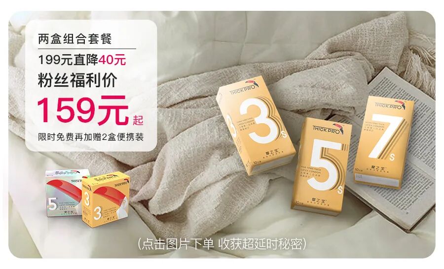 比起其它的方法,超鸟•犀之宝避孕套让人更安心,能够安全、无副作用的提升嗳嗳质量,最重要的是价格也很合适~和品牌方磨了很久很久,才给大家争取到非常优惠的价格,购买两盒直降40元,前200名下单的粉丝额外赠送2盒价值80元的体验装!