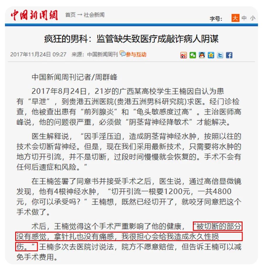 杨海峰09年开始从事计生行业电商工作,他发现一个叫“水晶套”的产品(厚度达20张A4纸的套套)一年竟然售出几十万个,这让他惊讶和不解。后来,一个顾客向他倾诉,由于持续生理性敏感早xie,他对爱人很愧疚,为了延长时间,他试过各种办法(包括水晶套、麻醉剂、药物等),最后去医院做了敏感神经切除术,切都切了,悲催的是没有效果。其实,中国性学会性医学专业委员会男科学组发布的《2016版中国男科疾病诊断治疗与专家共识》提到:阴茎背神经术是一种不可逆转的神经破坏性手术,目前本手术的疗效还缺乏循证医学的依据。