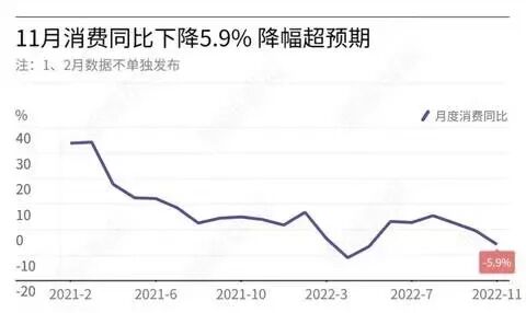 中国11月社会消费品零售总额同比减少5.9%,前值减少0.5%。