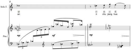 人声开始于第6小节,诗词“江南好”的主题音调在♭B宫调系统进入,与引子最后的E宫又形成了十二律范围内音的增补关系,♭B音再次显示出准主音的意义。6-8小节为歌曲的第一乐句,音高关系以宫系统下五度的延伸来发展:♭B宫-♭E宫(第6小节)-♭A宫(第7小节),最终结于♭D宫调系统的宫音(乐句的准主音、第8小节),突出了“风景旧成谙”的诗意。四个近关系宫系统内仍添有少量的偏音,并且依然以低音的线性进行“G-♭B-♭A-G-F-♭E-♭D”相衔接。