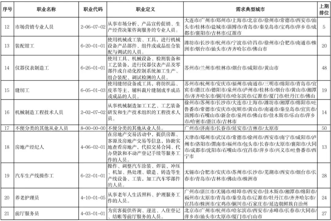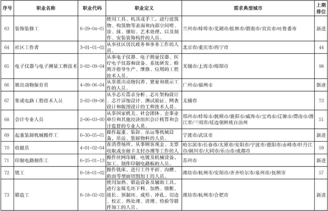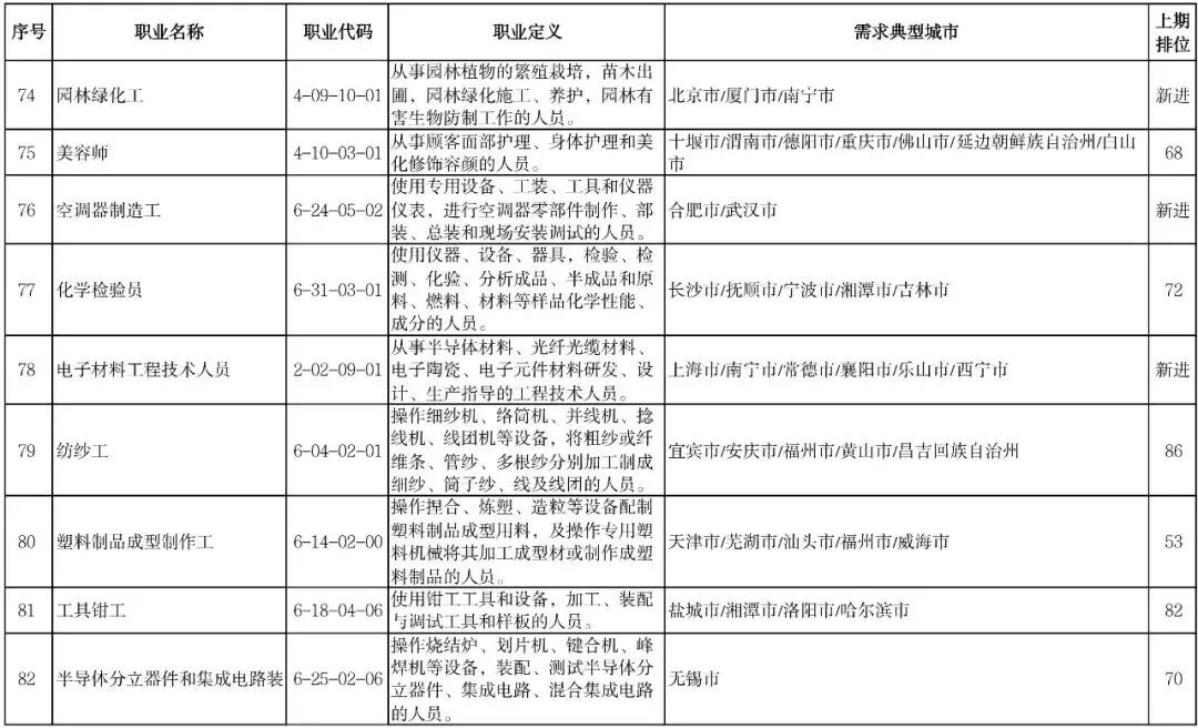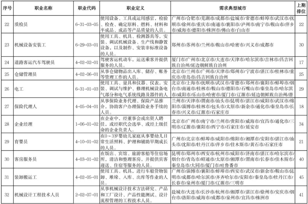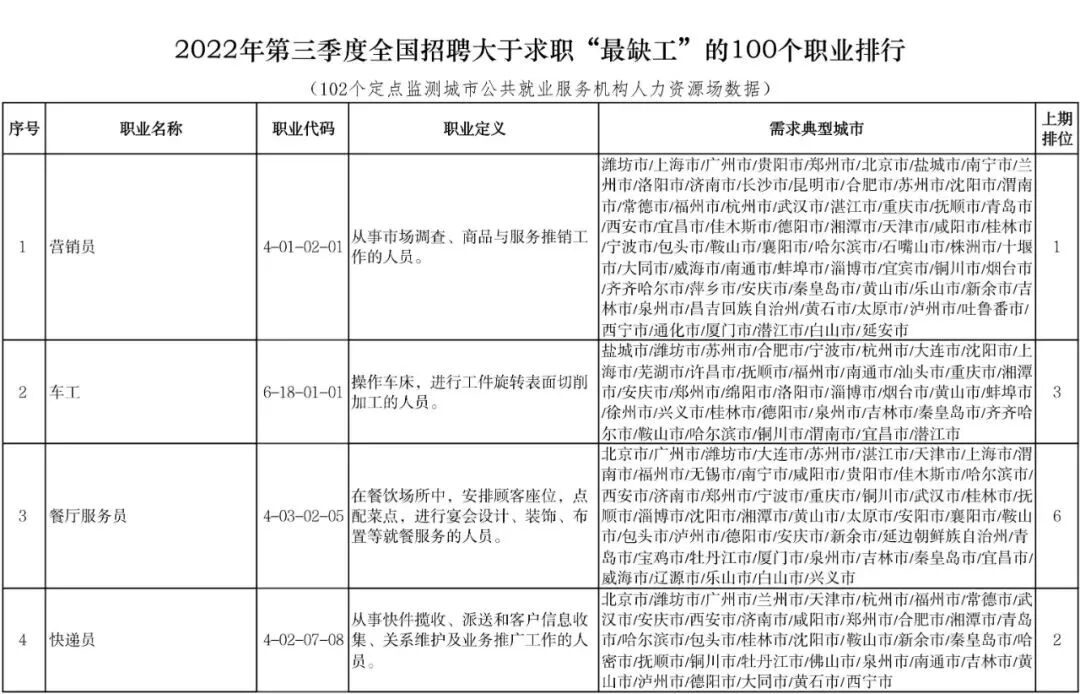 根据近日中国就业培训技术指导中心公布“2022年第三季度全国招聘大于求职‘最缺工’的100个职业排行”,营销员、车工、餐厅服务员、快递员、保洁员位列排行前五。