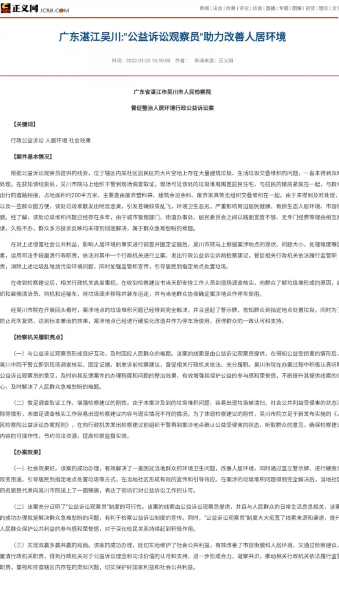 2021年8月,最高人民检察院决定在全国检察机关开展为期一年的“为民办实事 破解老大难”公益诉讼质量提升年专项活动。近日,检察正义网公布了首批“千案展示”案件,广东省有20件案例入选,其中我院“公益诉讼观察员助力改善人居环境” 案为湛江市入选案例之一。