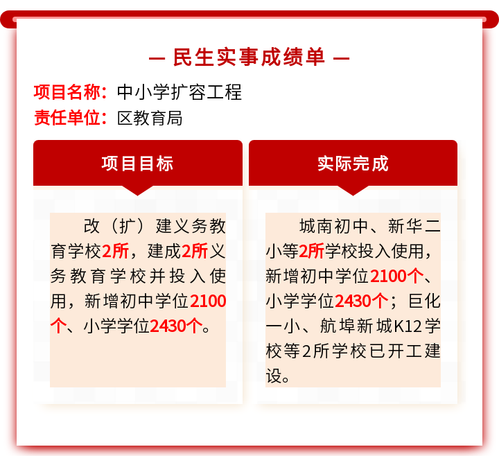 全力推进学前教育扩容提质工程,2022年,积极谋划新建杨浦幼儿园等7所幼儿园;高质量完成九龙幼儿园等7所幼儿园新建和投入使用任务,新增学位2700个,实现公办园在园幼儿数达11451人,同比增长1582人。积极争取省政府激励项目,持续对接市教育局、省教育厅,并得到高度认可,使我区成为被省教育厅推荐参选省政府激励项目的4个县市区之一;认真谋划落实义务教育学校项目建设,全面完成城南初中、新华二小建设项目并顺利开学,新增小学学位2430个,初中学位2100个。努力推进航埠K12学校-航埠新城初级中学新建、尼山小学拆扩建等项目建设工程。
