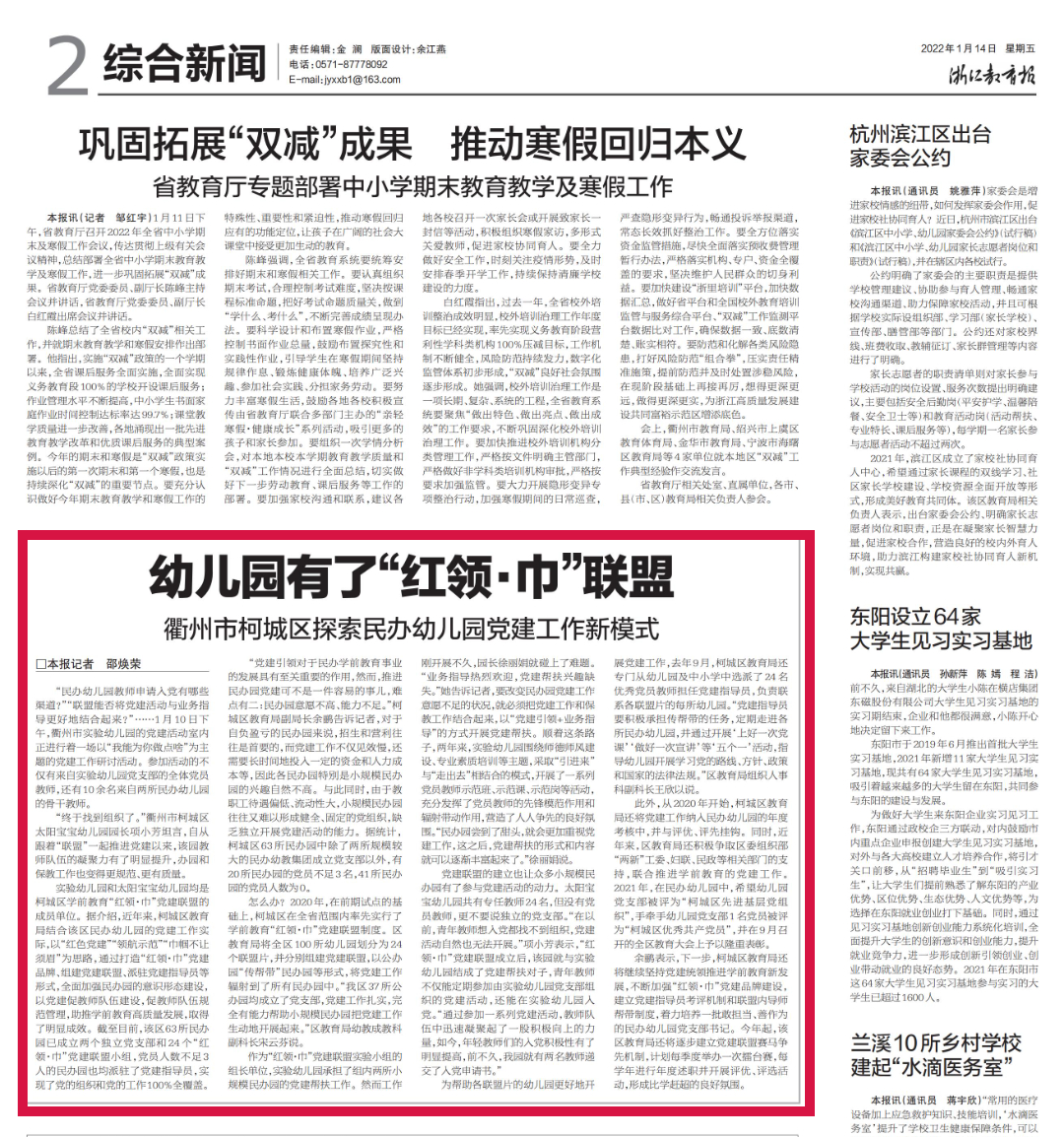 按照省级民生实事项目建设要求,圆满完成我区六所学校(兴华中学、花园小学、白沙小学、万田小学、石梁镇中心学校、沟溪小学)与余杭区六所学校结成跨地区教育共同体。跨地区教共体工作已全部通过省教育厅基本项目和加分项目验收考核。
