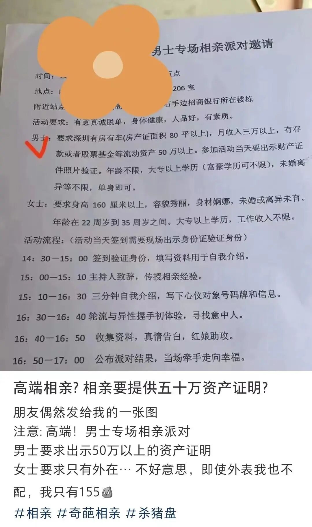 过去的一些「985硕博局」相亲活动就已经劝退了广大男女同胞,现在此类 资产千万级起步的相亲标准更是令人瞠目结舌。