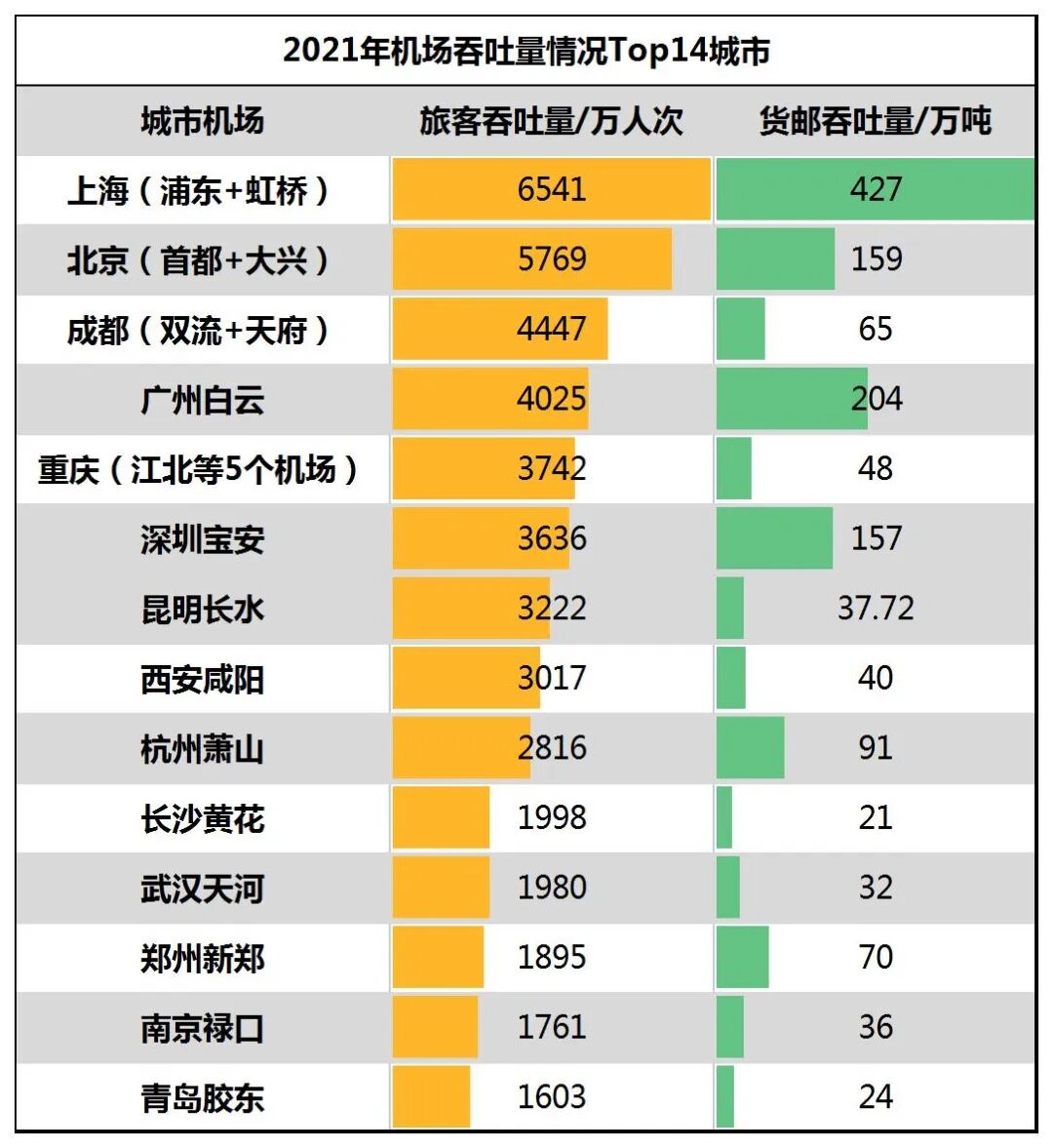 从运输规模来看,在疫情影响下,曾经霸榜第一第二的上海浦东与北京首都国际机场让位给了广州白云、成都双流。但由于上海、北京、成都都是拥有双大型民用运输机场的城市,所以在城市整体运输层面上,上海依旧是中国航空第一城,其2021年两个机场的合计旅客吞吐量人次高达6541万。深圳、昆明、西安、杭州、长沙、武汉、郑州、南京、青岛同样位居全国前十四。