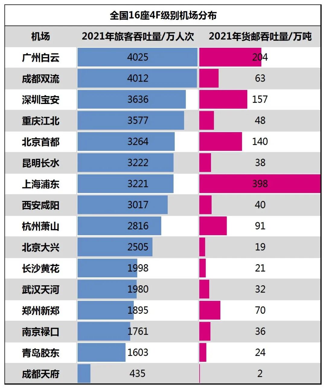 广东21个城市只有9个城市拥有机场,一大半城市没有机场。江苏13太保也只有9个城市拥有机场,其中苏州是全国唯一一个人口千万以上、GDP2万亿以上没有民用运输机场的城市。尽管关于苏州建设机场的传闻年年都有,但始终未能如愿。不过,从股权结构来看,无锡的苏南硕放机场,苏州拥有29.2152%的股权,这应该是苏州始终未能获批建设机场的最大原因之一。从城市角度来看,北京是真正的航空第一城,一座城市拥有两座4F级别机场(首都国际机场和大兴国际机场)。成都是全国第二个拥有两座4F级别机场的城市(双流国际机场与天府国际机场)。上海拥有一个4F级别和一个4E级别。