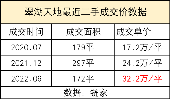 从链家公布的数据看,翠湖天地今年6月的低楼层成交单价,已经超过32万元/平方米,而2020年单价,在16万-18万元/平方米区间,两年间涨幅惊人。