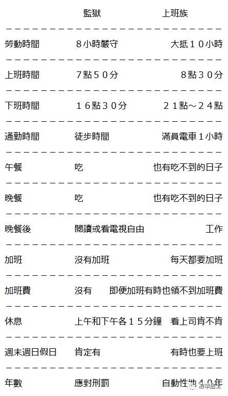 日本监狱里有工厂供囚犯工作,囚犯每月工作130-140个小时,还享受双休日。听起来工作时间很长?你只要平均下来,就是每天6.5小时,有多少上班族连每天8小时都只是奢望!
