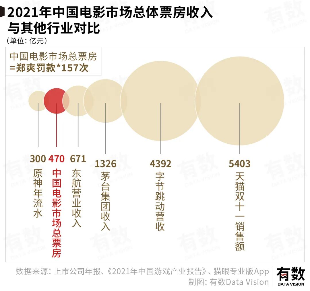 电影是个说大不大说小不小的市场。470亿票房可以给郑爽交157次罚款,但说小,也就是不到半个茅台的收入。