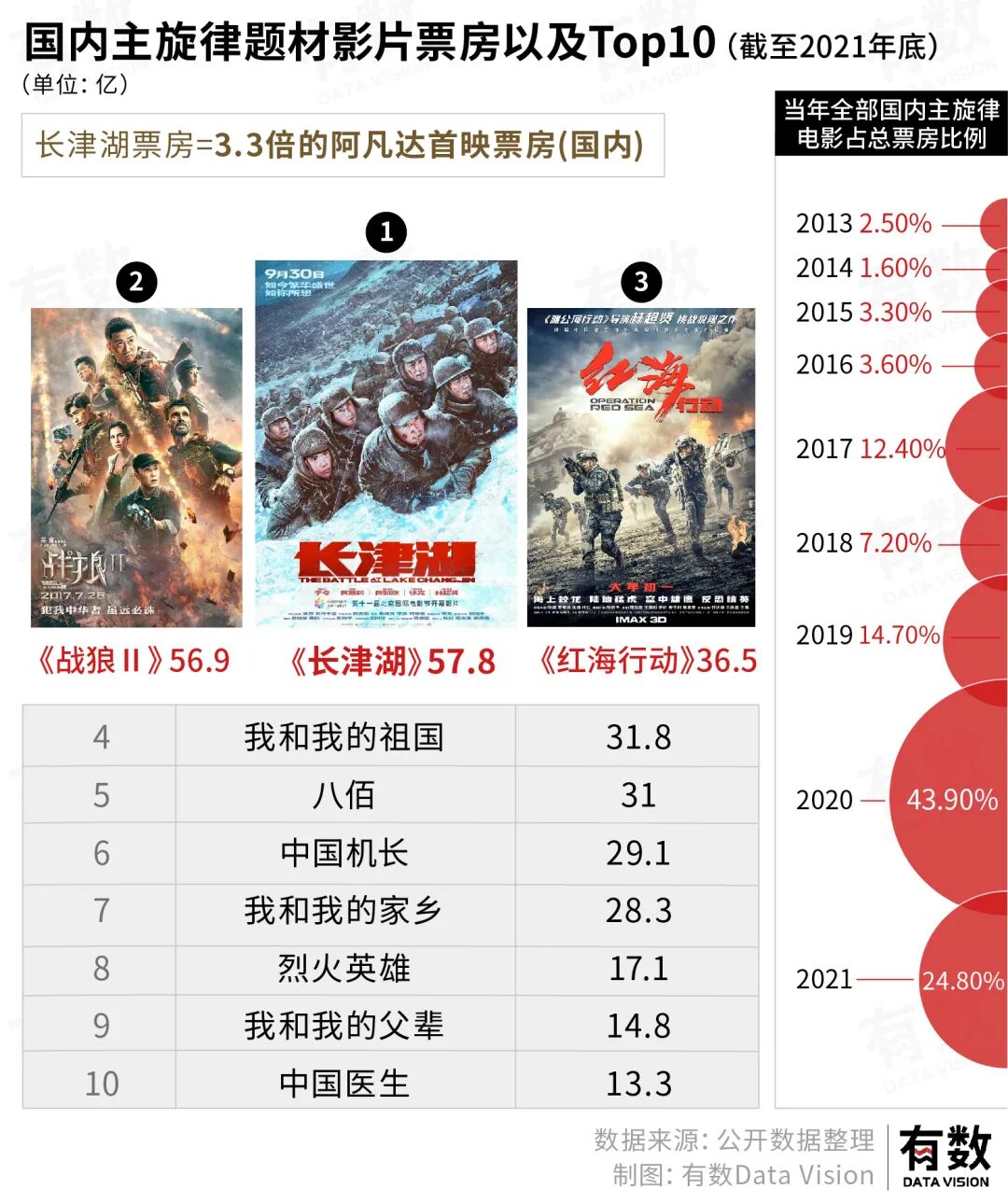 但在那一年,共有39部主旋律影片上映,总计票房116.8亿元,长津湖独占半壁江山。